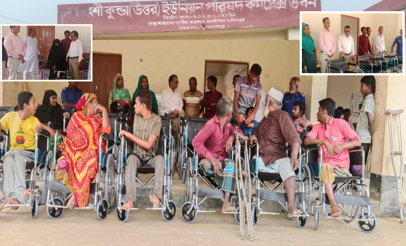 মধ্যনগরের উত্তর বংশীকুন্ডা ইউনিয়নে প্রতিবন্ধী ও হতদরিদ্রদের মাঝে হুইলচেয়ার ও সেলাই মেশিন বিতরণ।