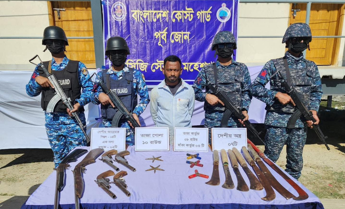 মহেশখালীতে কোস্ট গার্ড ও নৌবাহিনীর যৌথ অভিযানে বিপুল পরিমান অ’স্ত্রসহ স’ন্ত্রা’সী এক জন আটক।