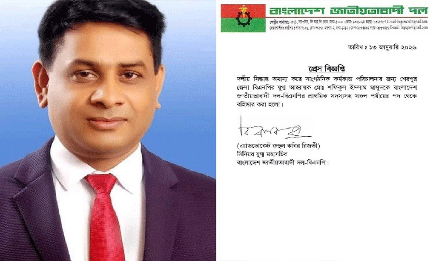 দলীয় সিদ্ধান্ত অমান্য করে সাংগঠনিক কর্মকাণ্ড পরিচালনার জন্য শেরপুর জেলা বিএনপির যুগ্ম আহ্বায়ক মো. শফিকুল ইসলাম মাসুদকে দলের প্রাথমিক সদস্যসহ